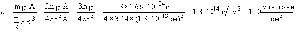 Масса одного нуклона в ядре mN ≈ 1 а.е.м. = 1.66·10-24 г. Плотность ядерной материи есть масса ядра, деленная на его объем