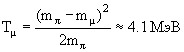 6.53. Определить энергию μ+ и νμ при распаде π+ → νμ + μ+, m(π+) = 139.57 МэВ, m(μ+) = 105.66 МэВ. Распад π+-мезона с вероятностью 99.99% происходит на две частицы: π+ → νμ + μ+. Масса π+-мезона равна 139.6 МэВ, масса мюона μ равна 105.7 МэВ. Точное значение массы мюонного нейтрино νμ неизвестно, но установлено, что она на несколько порядков меньше разности масс пиона и мюона. Так как разность масс π+-мезона и продуктов его распада равна 33.9 МэВ, для нейтрино необходимо использовать релятивистские формулы связи энергии и импульса. В дальнейшем расчете малой массой покоя нейтрино можно пренебречь и считать нейтрино ультрарелятивистской частицей. Законы сохранения энергии и импульса в распаде π+ мезона (используем систему Хевисайда): mπ