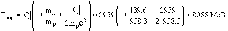 = (139.6 + 938.3 − 939.6 − 3097 )МэВ ≈ -2959 МэВ. Доля пороговой энергии, идущая на движение центра масс, составляет