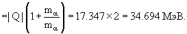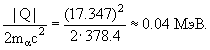 релятивистскую добавку. Даны избытки масс в МэВ: ΔLi = 14.908, Δp = 7.289 Δα = 2.425. Находим |Q| реакции: |Q| = ΔLi + Δp − 2Δα = 14.908 + 7.289 − 2·2.425 = 17.347 МэВ. Далее используем формулу (4):