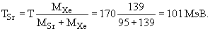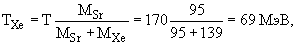 25. Наиболее вероятное деление 235U тепловыми нейтронами приводит к появлению в качестве осколков ядер 139Xe и 92Sr с суммарной кинетической энергией Т ≈ 170 МэВ. Определить, как распределяется эта энергия между ядрами 139Xe и 92Sr и каковы скорости их движения. Считать, что ядро делилось в состоянии покоя.